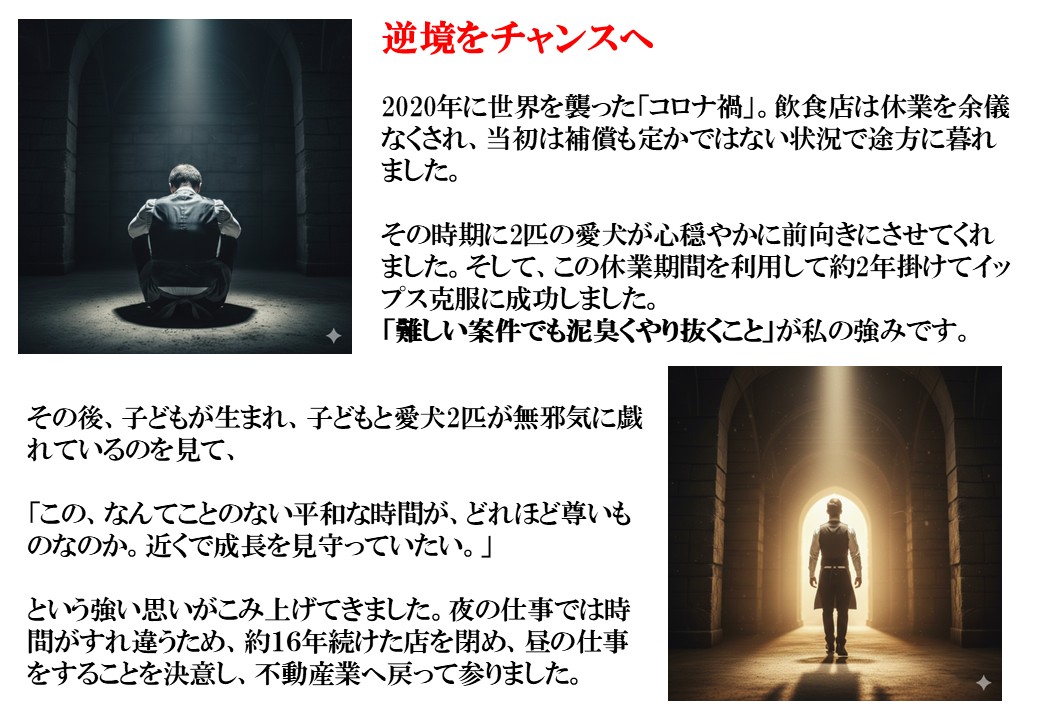 私はダーツの挫折から這い上がり、父として、そして「はな・まる」の飼い主として、泥臭くも誠実な歩みを大切にしてきました。お客様の「不安」が「安心」に変わるまで、私は決して手を離しません。