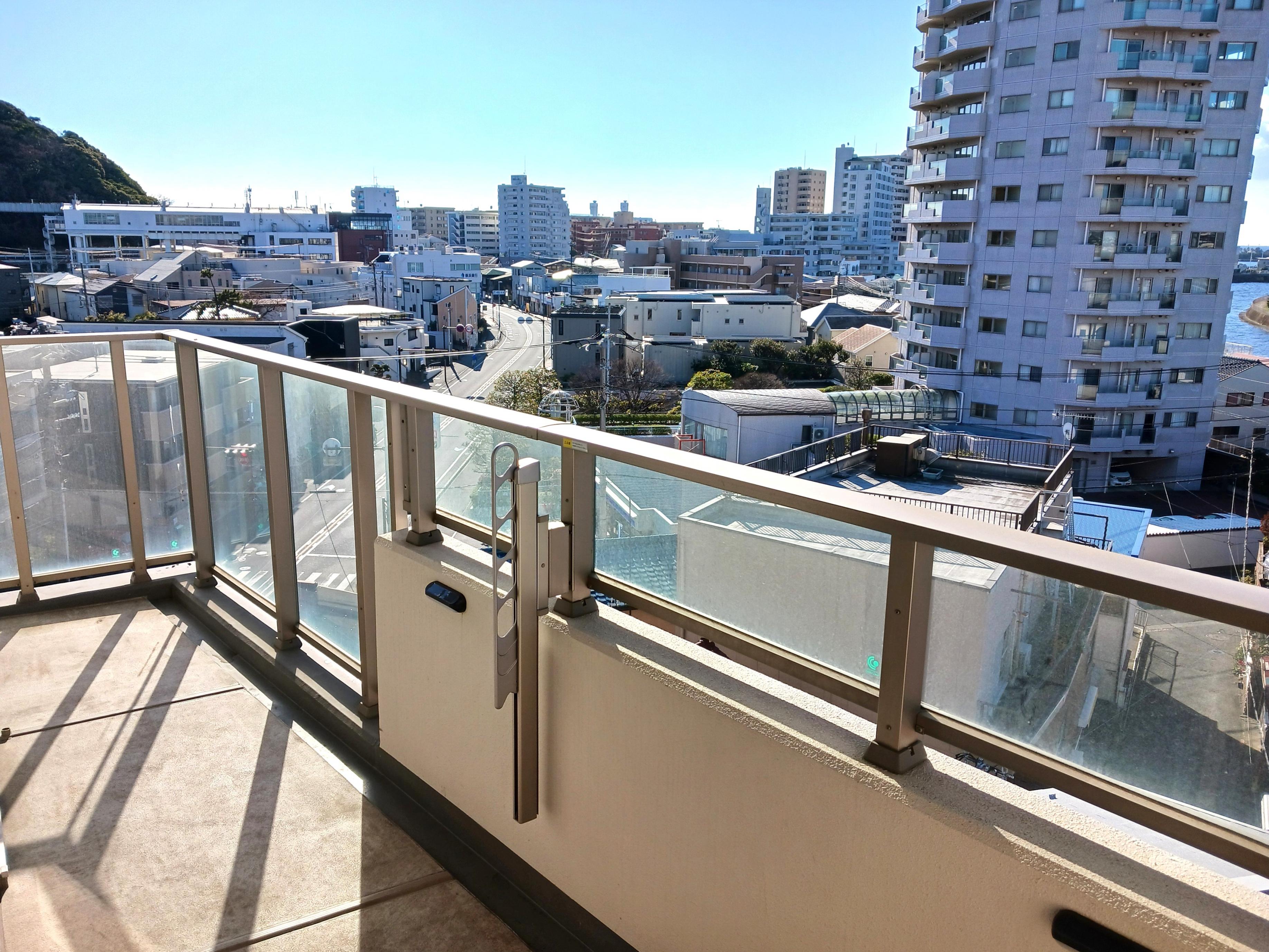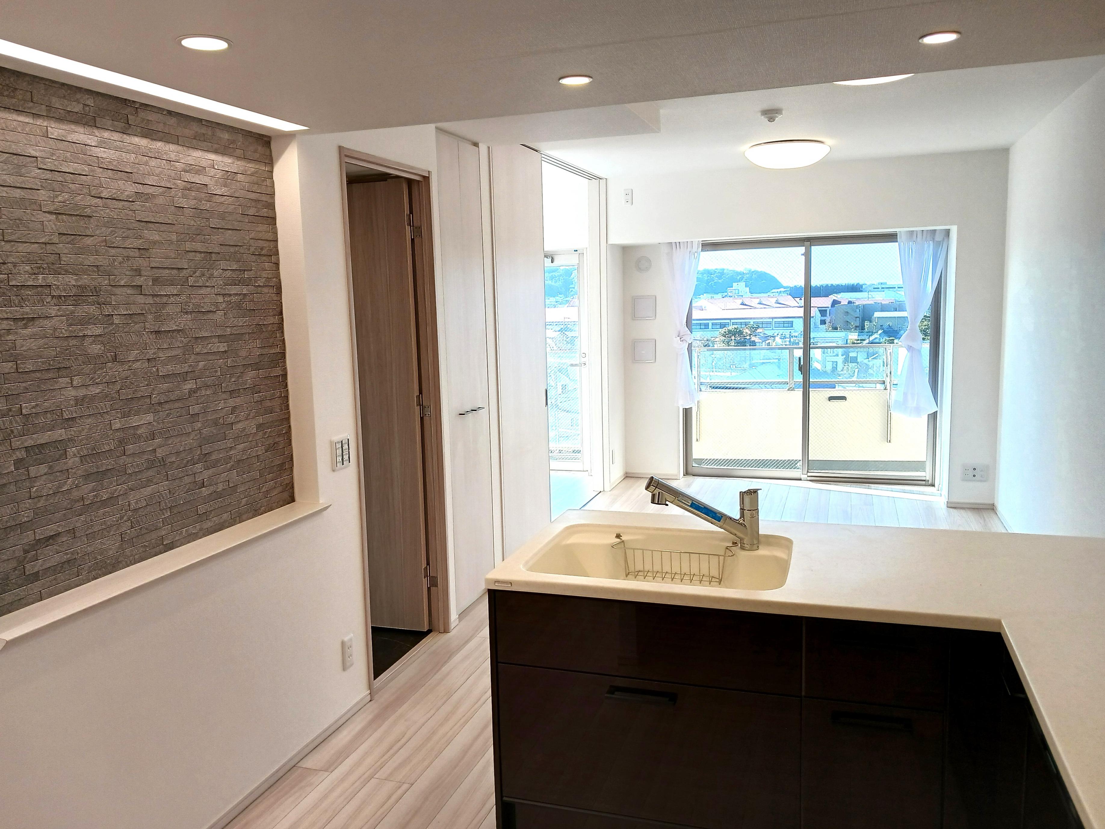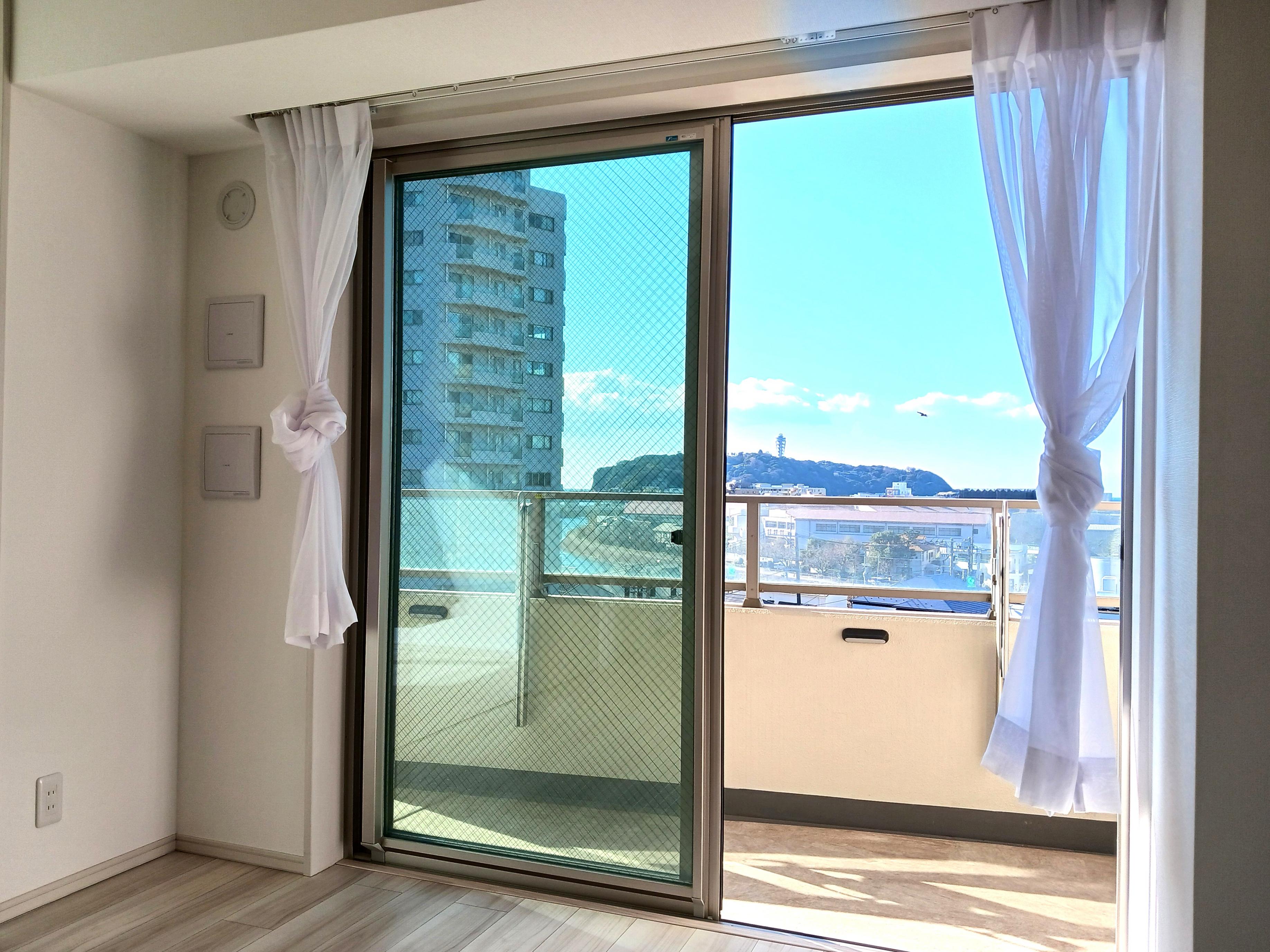 ![]() 開放感のあるバルコニー | ![]() 座った高さからの江の島 | ![]() キッチンからも江の島 |