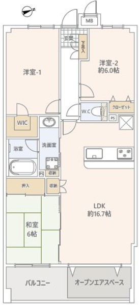 ![]() 77.02㎡・3LDK | ![]() 約16.7帖のリビング | ![]() 掃出し窓で開放感◎ |