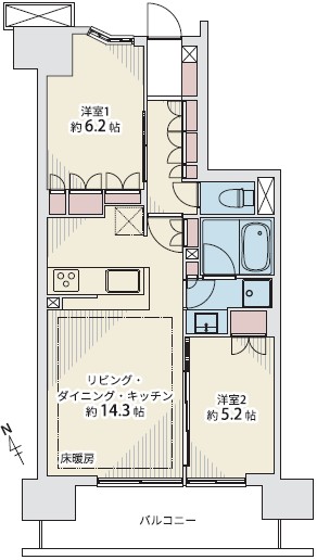![]() | ![]() LDK約14.3帖 | ![]() LDK・洋室レールなく平らです |