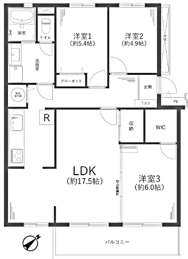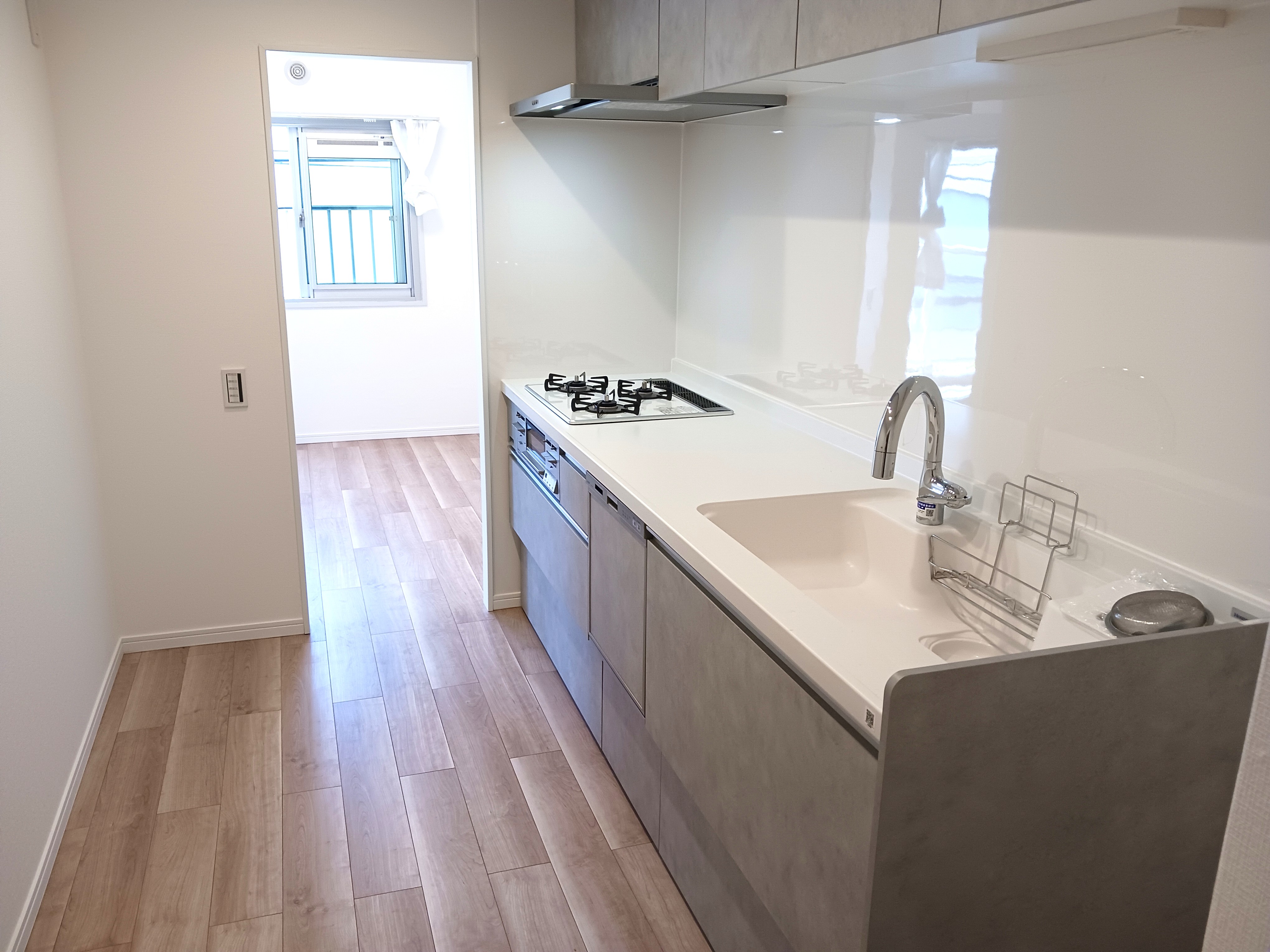 ![]() ウォークスルーのキッチン | ![]() 洗面・浴室・トイレ | ![]() 約4.9帖洋室 |