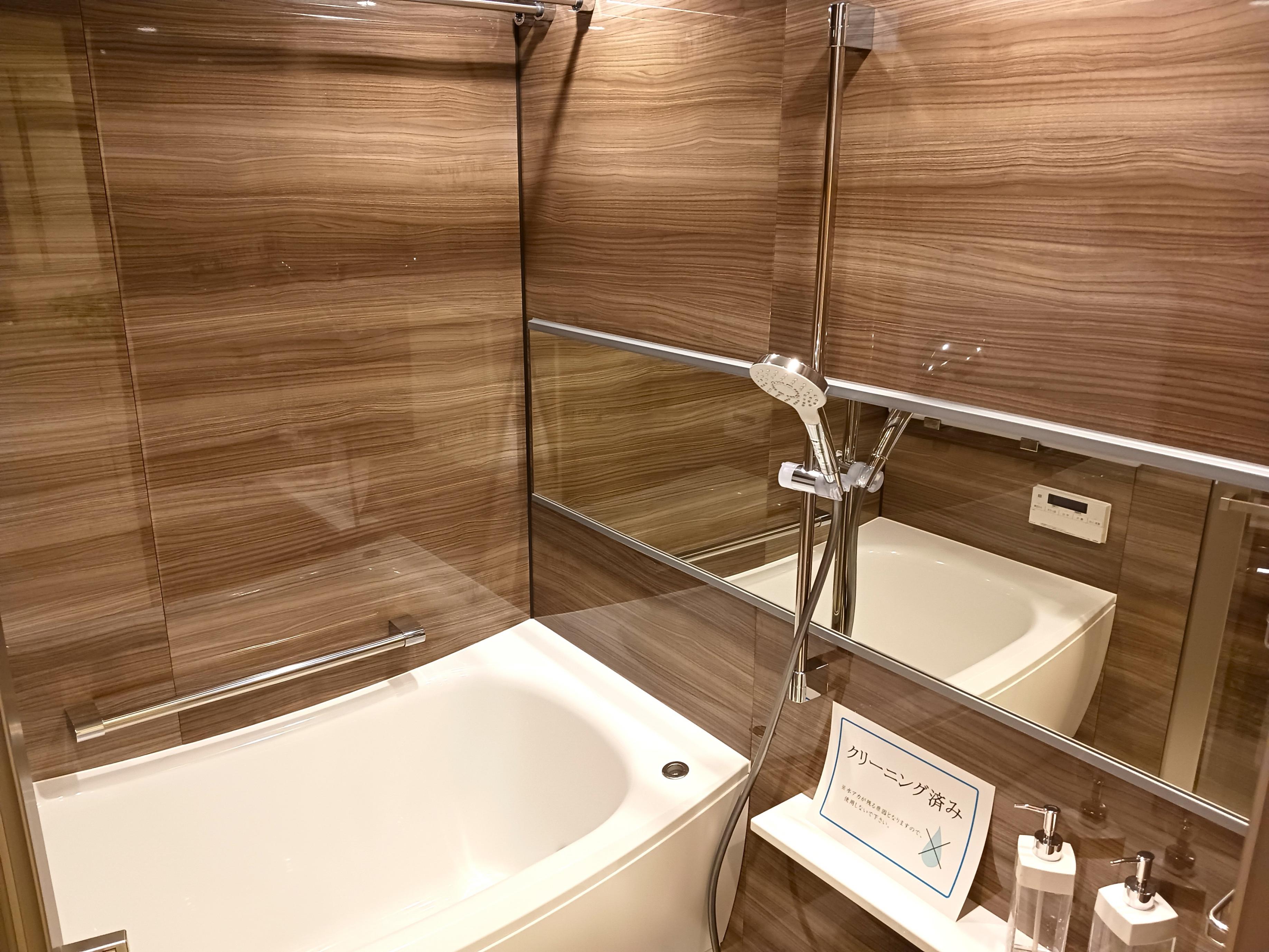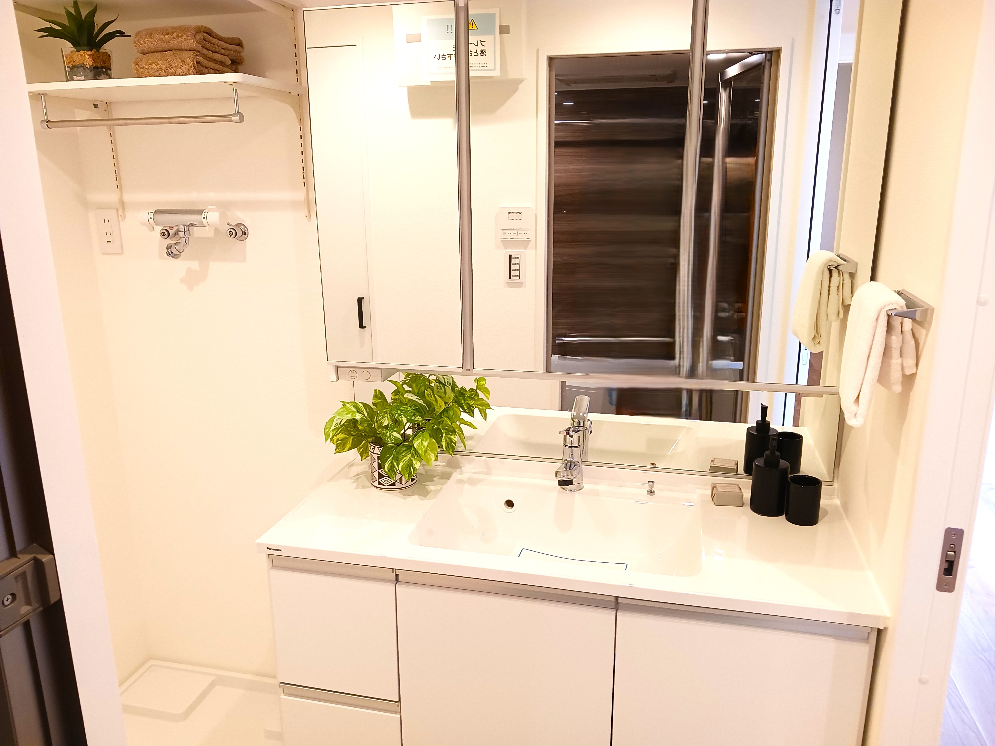 ![]() 洗面化粧台・洗濯機置場 | ![]() 大きな鏡で広く感じます | ![]() ウォシュレット付 |