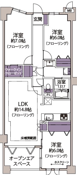 ![]() 75.90㎡・3LDK+WIC | ![]() 約16.7帖のリビング | ![]() リビングの延長のよう |